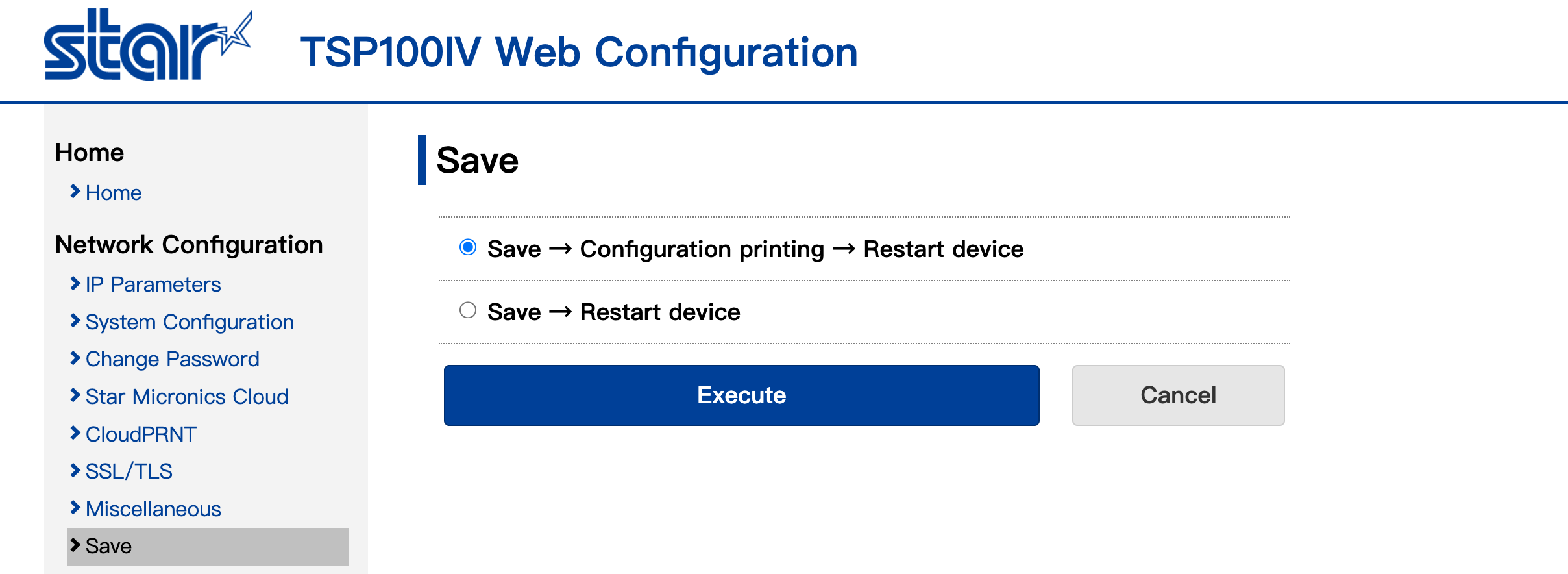 完成以上設定後，按下「SAVE」或「儲存」按鈕，讓打印機重新套用 CloudPRNT 設定。