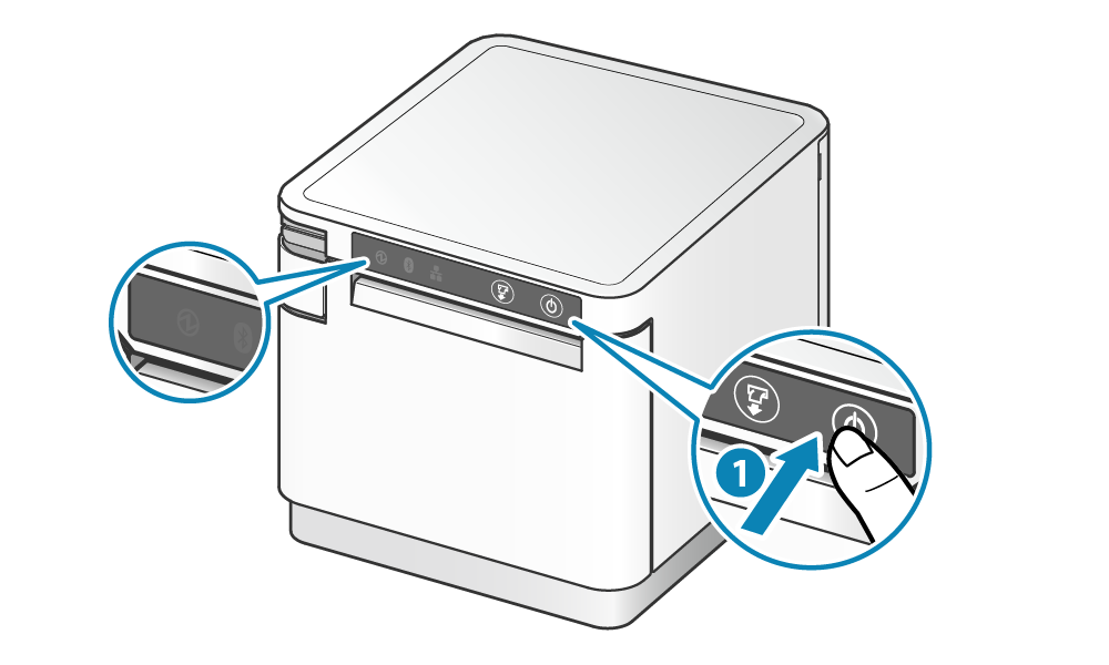 * 按住 FEED 按鍵不放①，同時按一下電源按鍵② ，開啟電源。