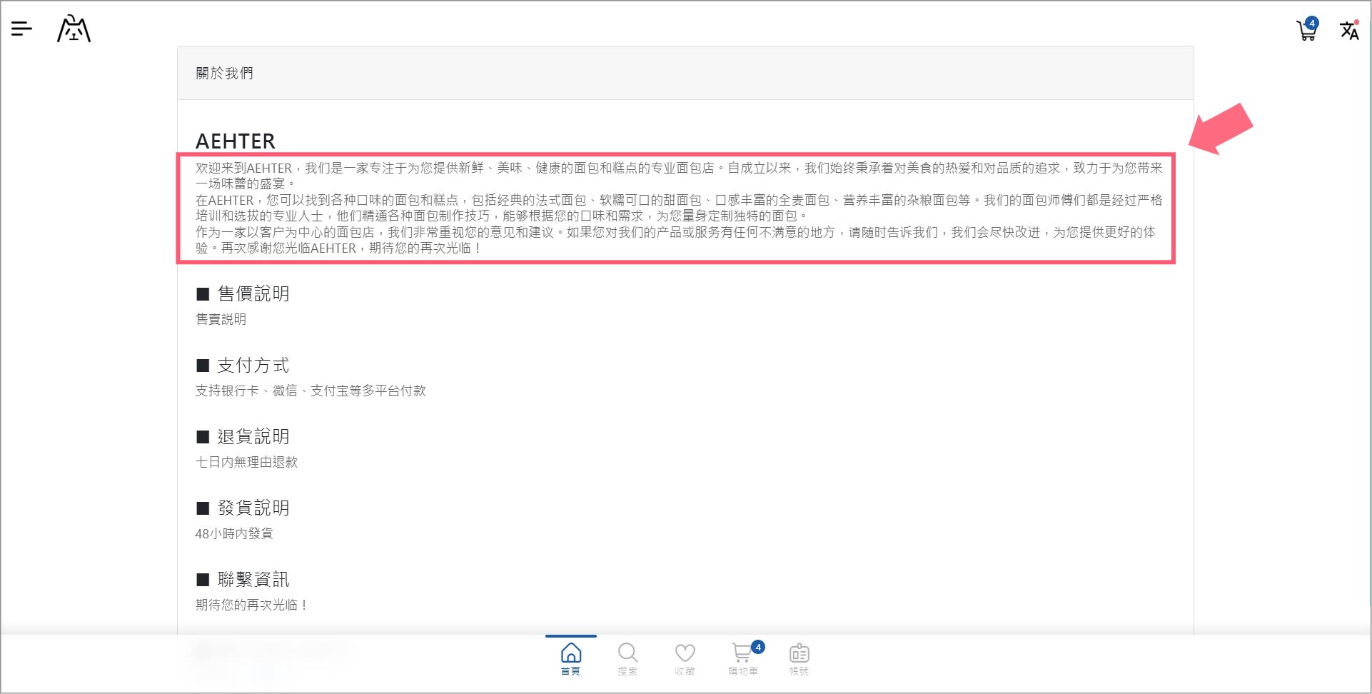 編輯完成后，點擊主頁店鋪「關於我們」會顯示所輸入的文本。