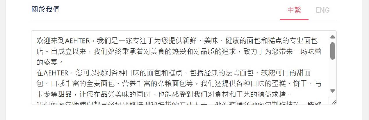 <figure><img src="https://2949966653-files.gitbook.io/~/files/v0/b/gitbook-x-prod.appspot.com/o/spaces%2FdYY8T3bU6FOxyrweXXUf%2Fuploads%2FeNzjijxkkT2K6LRYLlWK%2F52.jpg?alt=media&#x26;token=bfeccbe3-7a78-4ed2-8c59-9b1c48bf03ea" alt=""><figcaption><p>「關於我們」編輯界面</p></figcaption></figure>