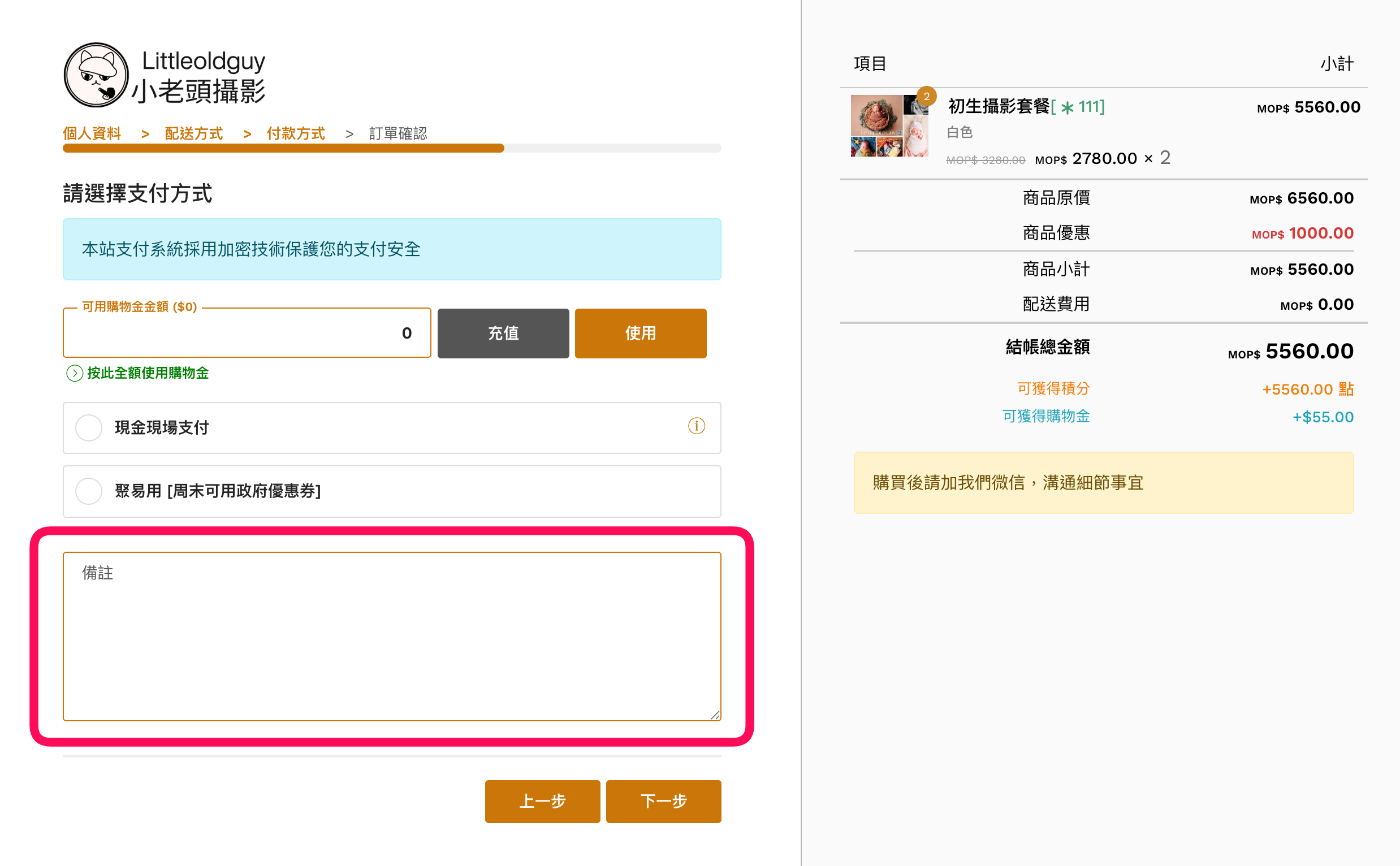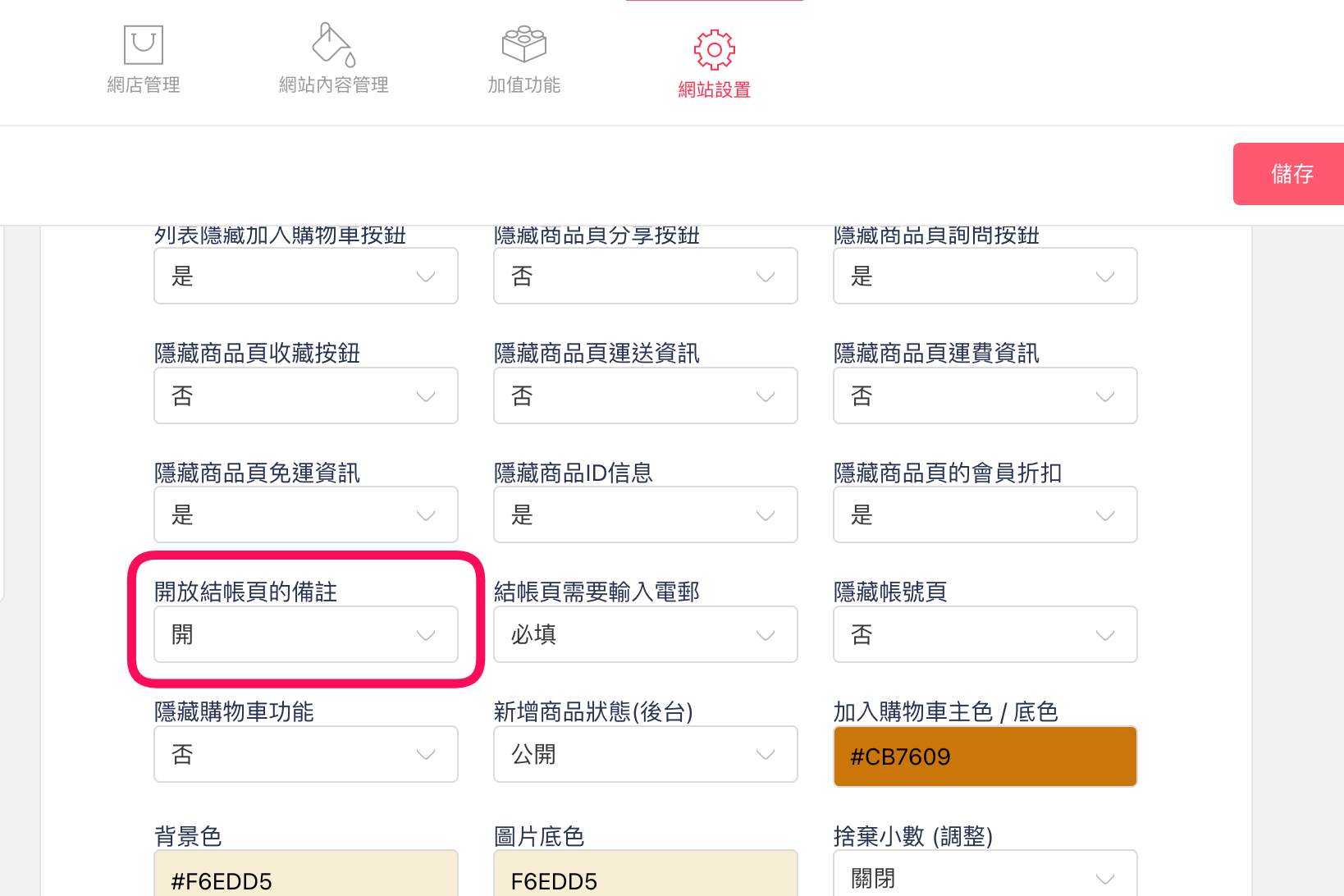 * 按下「開啟結賬備註」後，結帳頁就會顯示備註欄位，供買家填寫需求。