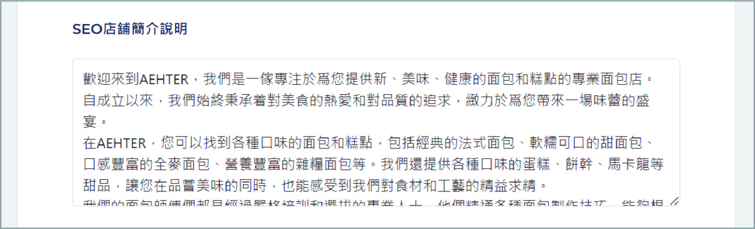 輸入「SEO店鋪簡介説明」的文本内容。