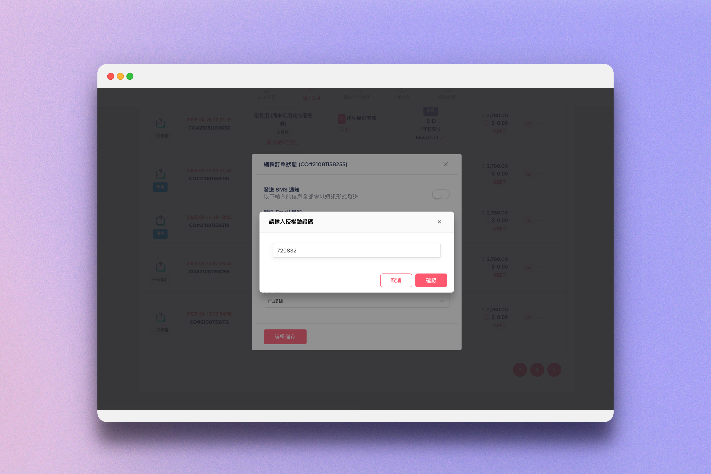 當商家點選「修改已完成訂單」時,系統自動跳出驗證碼輸入框。