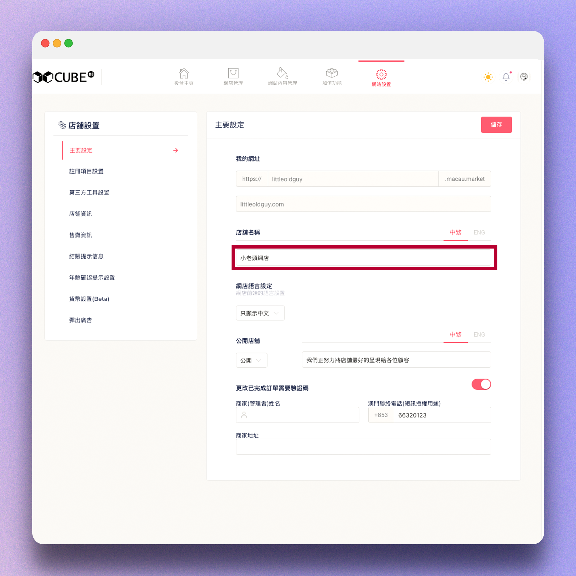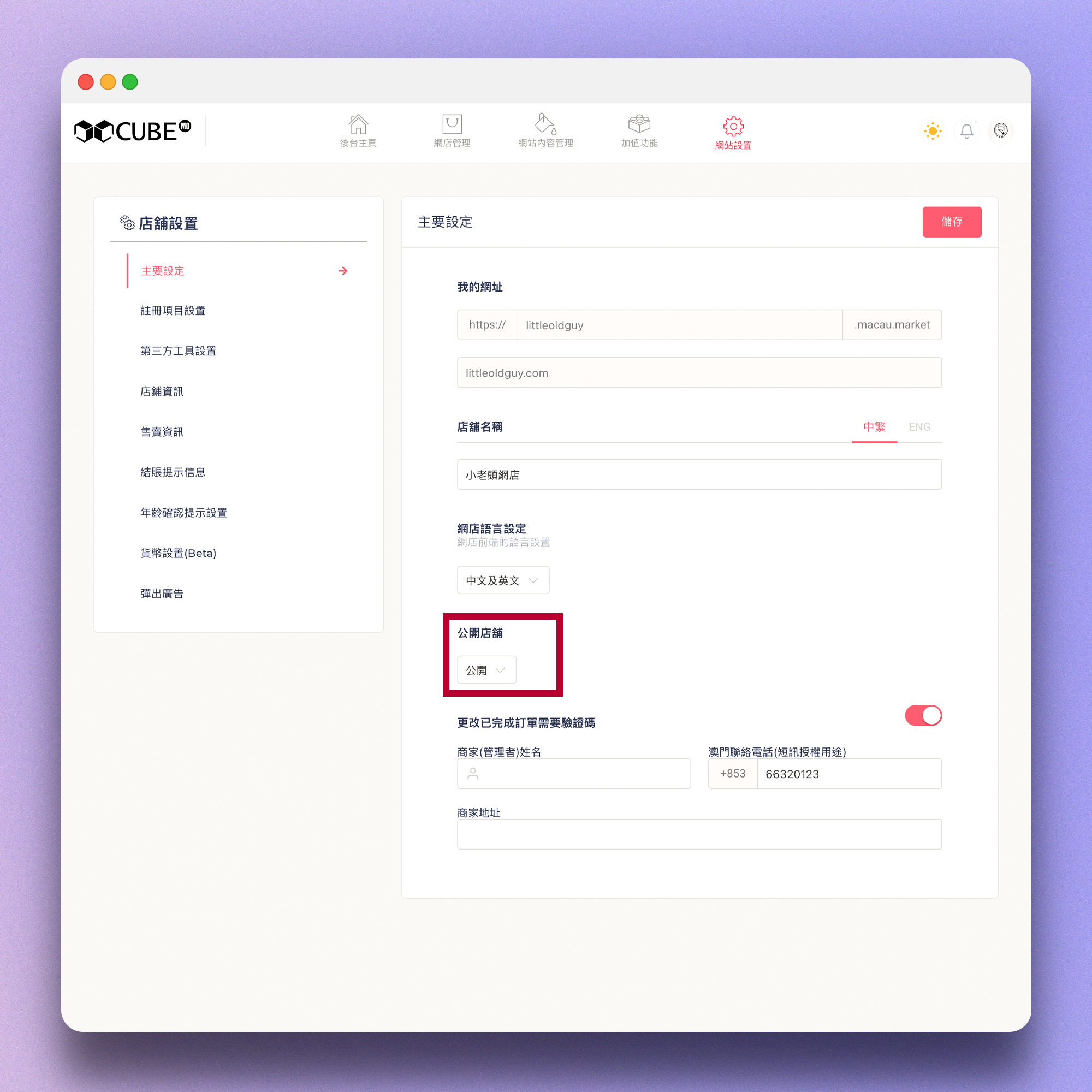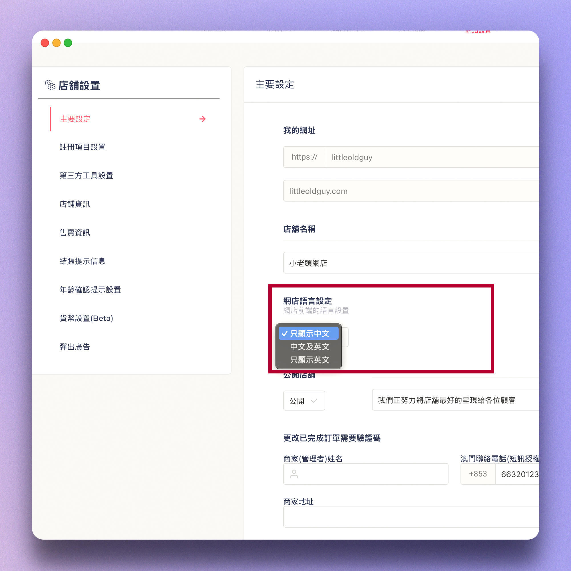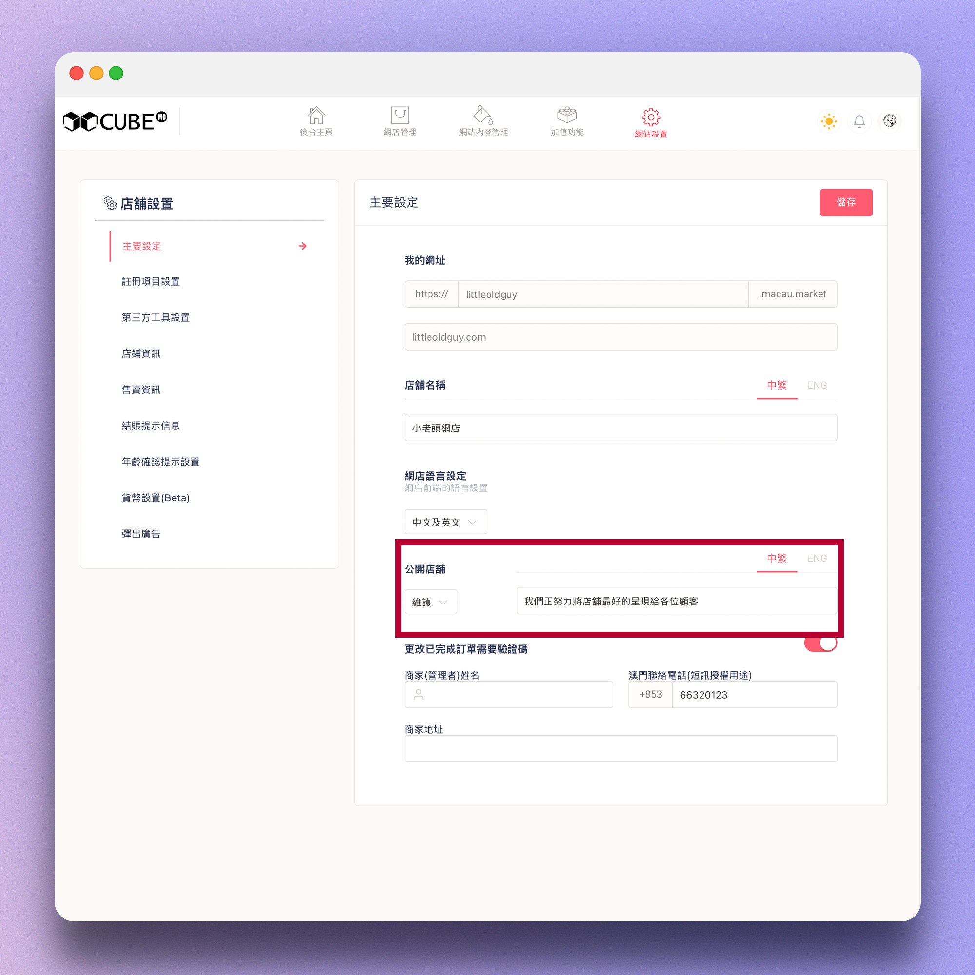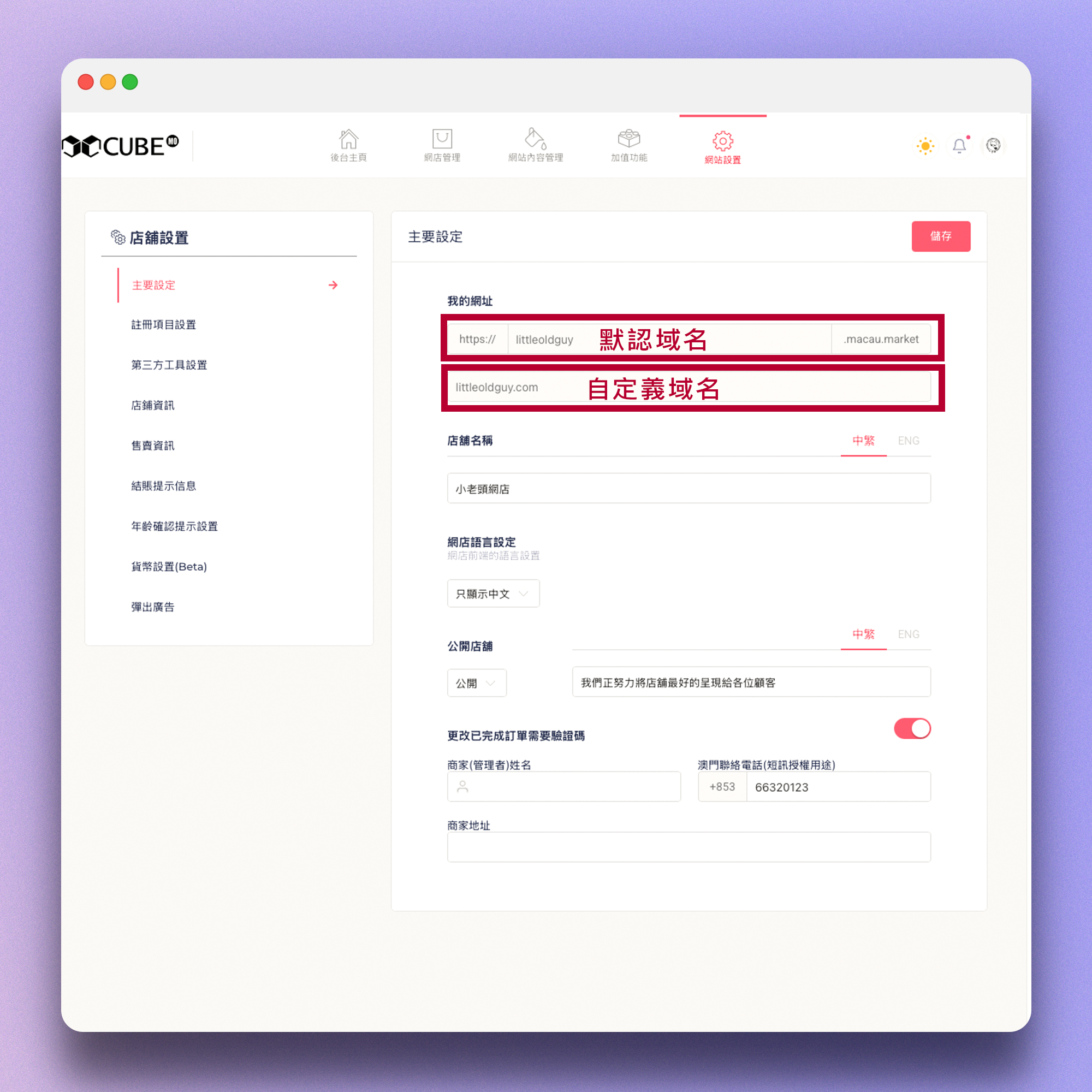 系統會自動為商家生成默認網站網址,顯示在圖上的第一欄。 例如: https://littleoldguy.macau.market